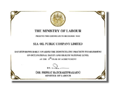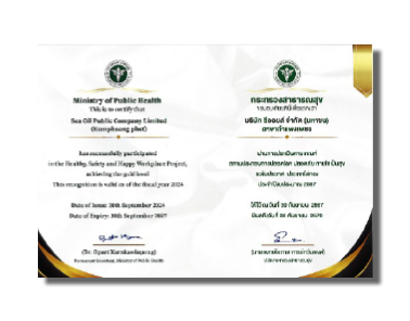 Sea Oil Public Company Limited (Kamphaeng) was awarded of Healthy, Safety and Happy Workplace Project (Gold level) by the Ministry of Public Health was presented for the year 2024.