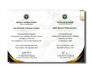 Sea Oil Public Company Limited was certified for the Healthy, Safety, and Happy Workplace Project Achieving Silver Level in 2024.